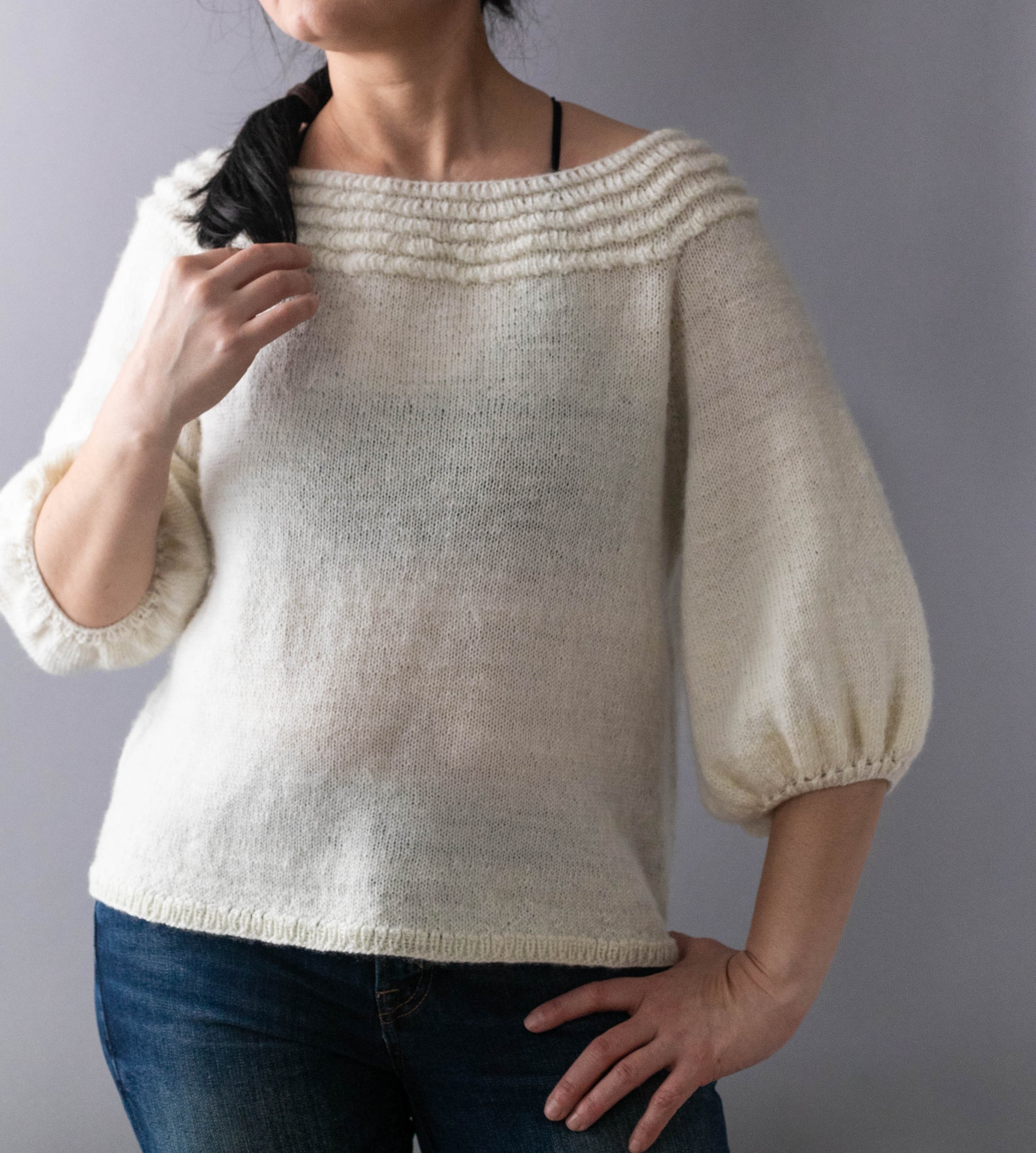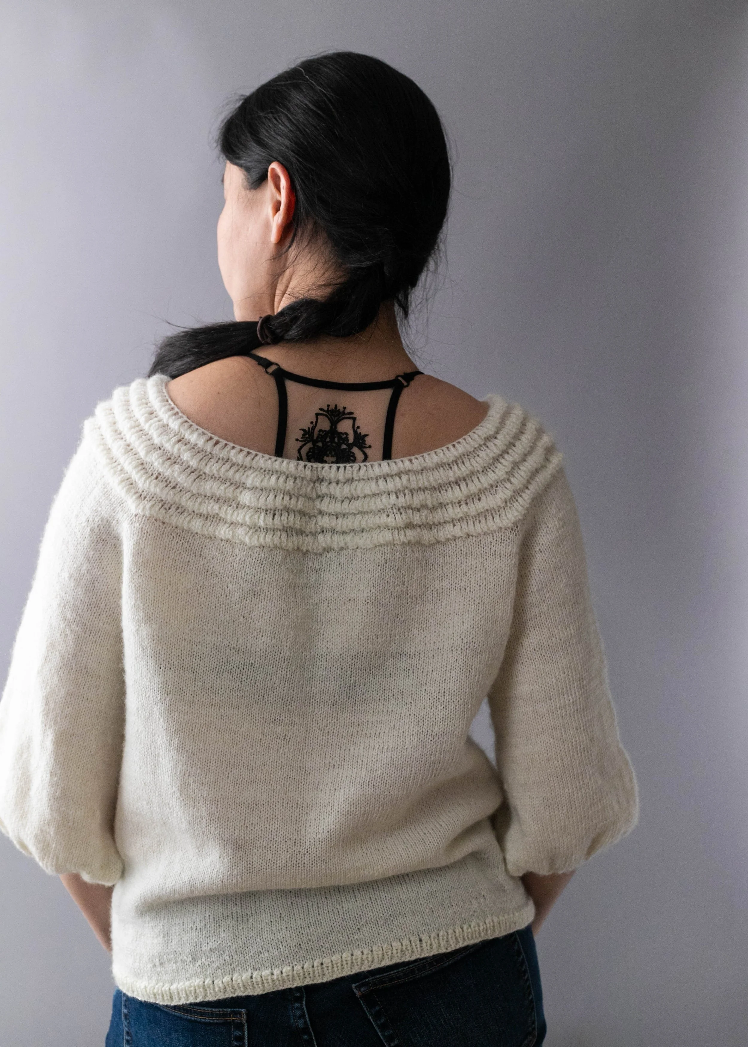 ’Aua’ means ‘air’ in Kazakh, a fitting name for this light and airy pullover that features a puffy, textured stitch pattern in the yoke. The puffiness of the stitch pattern is then mirrored in the sleeve shaping, keeping the pullover as fluffy as ever.