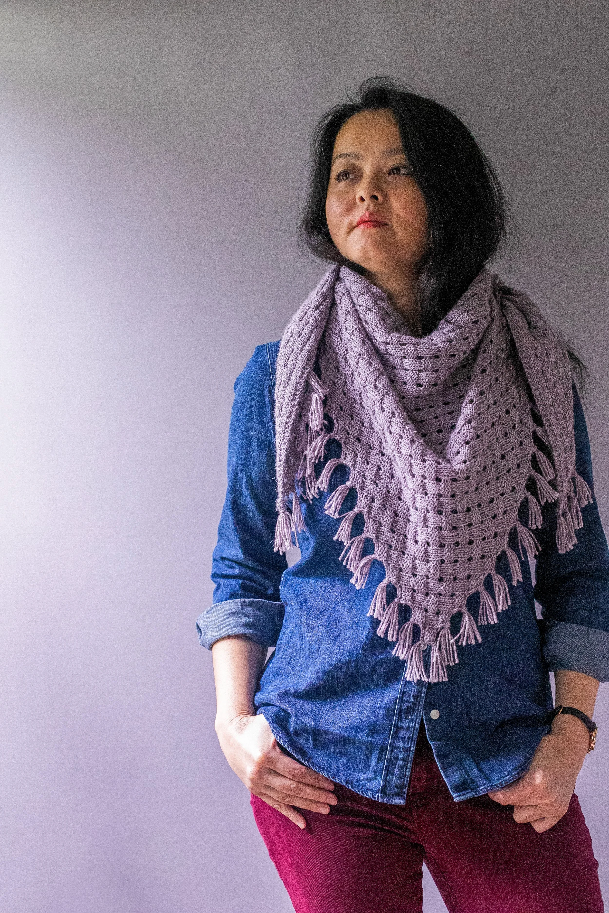 This triangular shawl is worked sideways, starting from the right tip and ending with the left tip. While it is not essential to do a gauge swatch before casting on, I recommend steam-blocking the first 6”/15 cm of your knitting to ensure you like the fabric’s feel. It should be fairly loose and flowy.