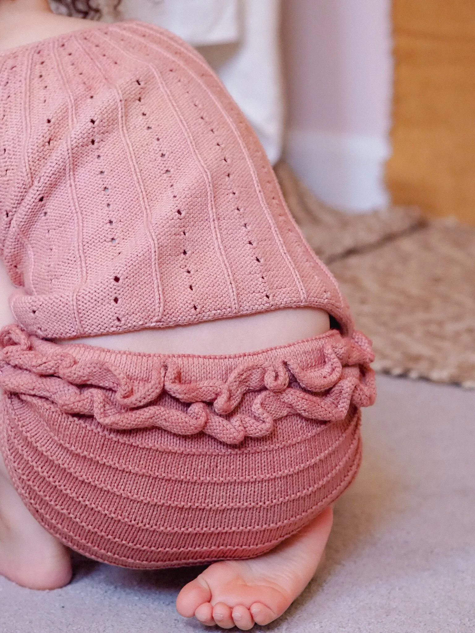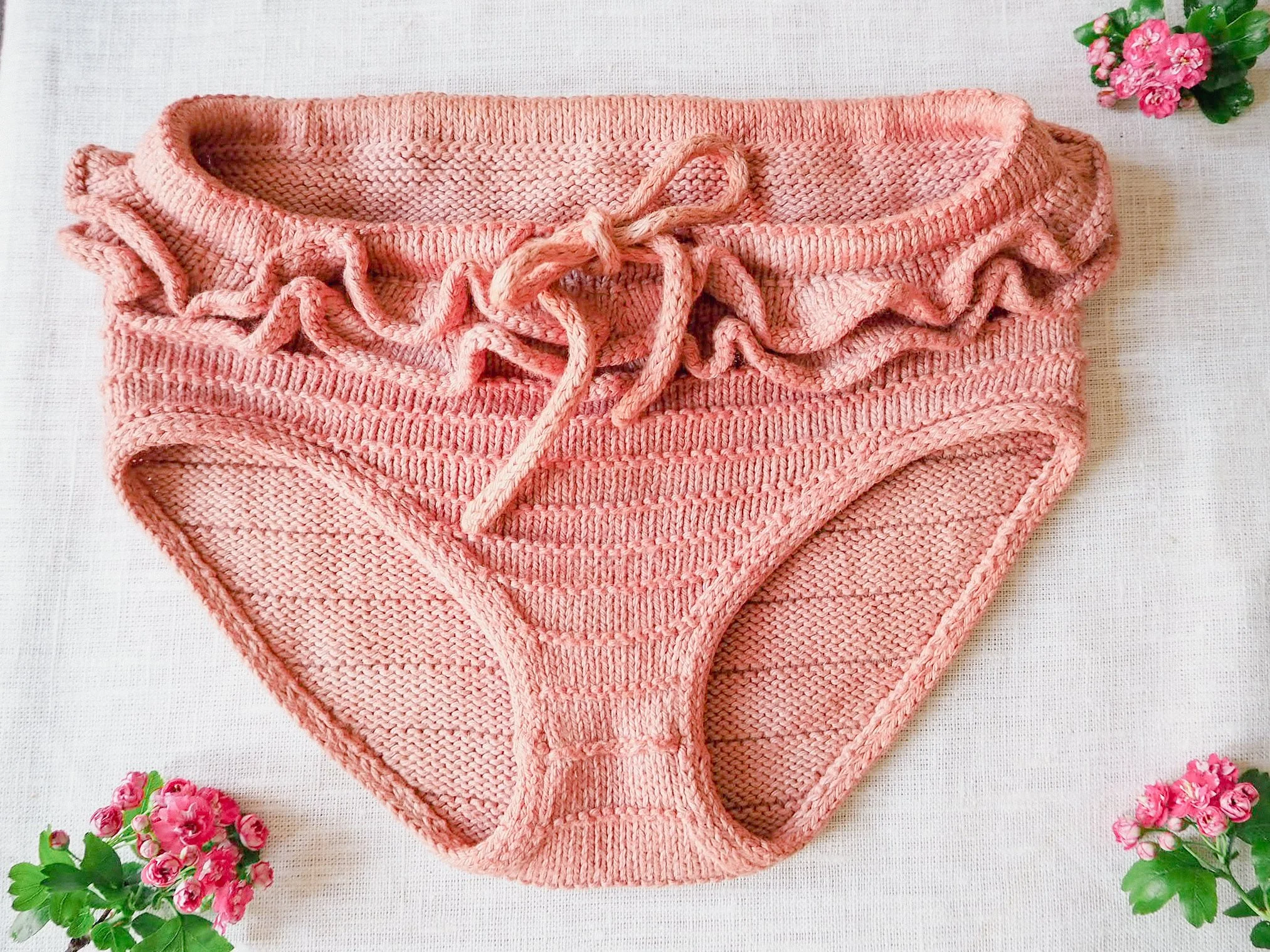 You will work these bloomers from the top down and in the round, then you will separate the front and back to work them flat. You will then graft the crotch, pick up stitches around leg openings and finish the legs with the applied I-Cord method. The waistband has two versions: one with an elastic band for simplicity and convenience (Version 1) and another with ties for extra cuteness (Version 2). You can add as many ruffles as you like - we opted for just two!