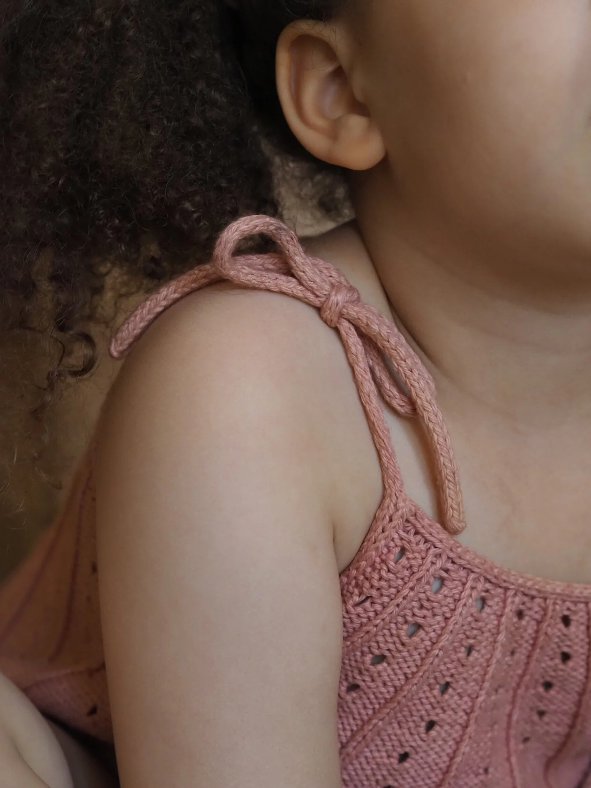 You will work this dress from the top down. First, you will work the front and back separately, then join them to work the A-shaped body in the round. You will pick up stitches around the armholes and work I-Cord to create neat edging and shoulder straps. You can make the shoulder straps with or without ties. You can also make a tank top length instead of a dress.